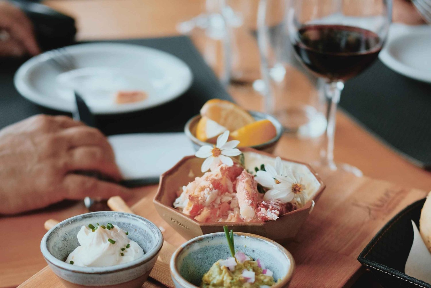 Essen: Meeresfrüchte-Tapas, ein Glas Wein und Wasser.