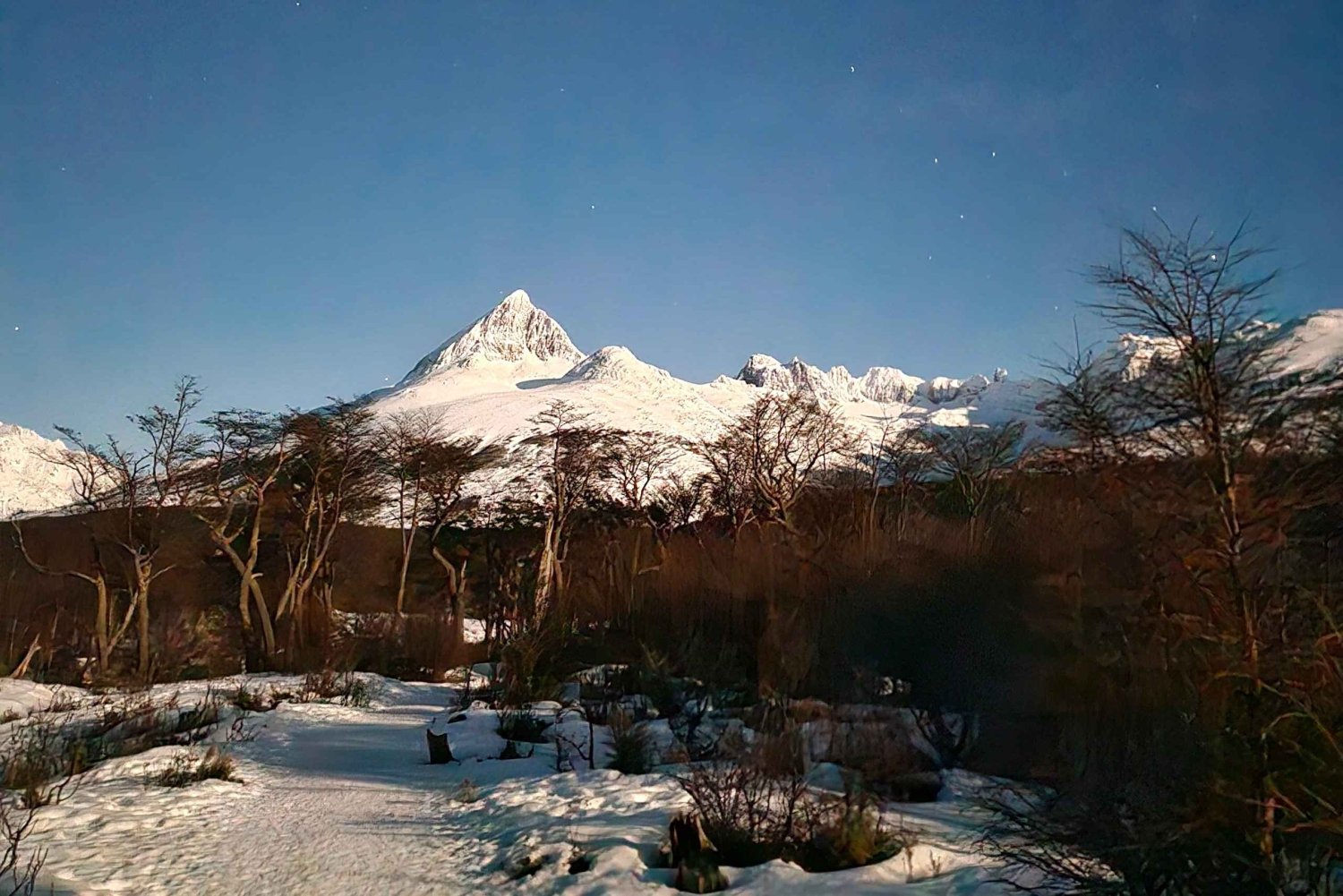 L'oscurità trasforma il paesaggio: i suoni della foresta si intensificano, la luce delle stelle ci guida e ogni passo diventa una profonda connessione con la natura della Terra del Fuoco. Lungo il percorso attraversiamo valli glaciali, antichi corsi d'acqua segnati da millenni di erosione, con spiegazioni che rivelano la storia geologica di questo ambiente.