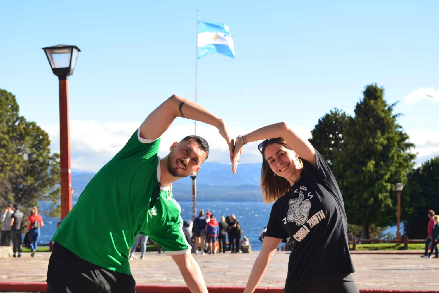 We gaan verder naar de klokkentoren waar we de essentie van het historische centrum, de architectuur en de Zwitserse Alpenstijl vastleggen. Tussen foto's en gelach door gaan we naar het gigantische bord met de letters van Bariloche. Onze inspiratie is het landschap van besneeuwde bergen en het meer Nahuel Huapi, waar we foto's maken aan de oever van het meer met kristalhelder water.