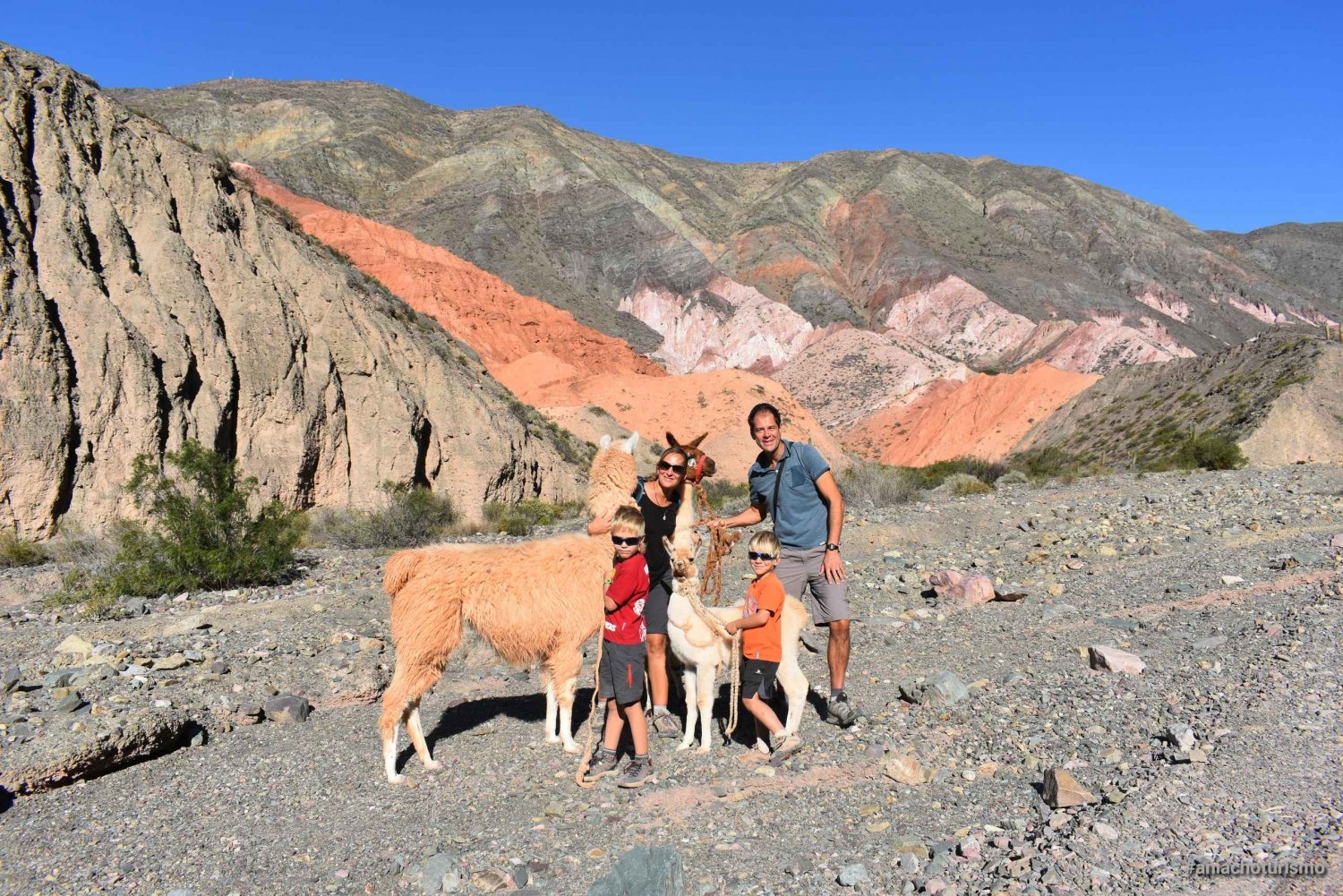 Mötesplatsen ligger 200 meter från torget i Purmamarca. Här kontrollerar vi nödvändiga förnödenheter för aktiviteten. Det är vid denna punkt som vi börjar kontakten med lamorna.